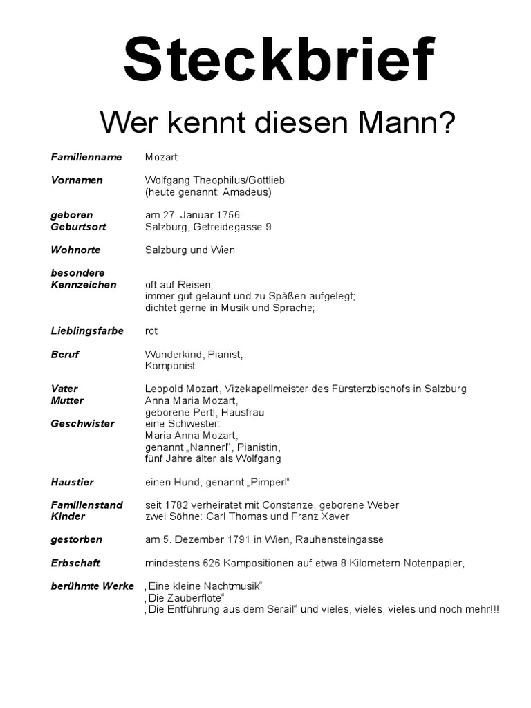 Joseph haydn steckbrief grundschule. Außerdem leitete er das orchester und die oper der wohlhabenden familie esterházy auf deren landsitz. Ihr könnt das material als kleine werkstatt im rahmen von stationen oder als reines lese bzw. Unter anderem stammt die melodie der deutschen nationalhymne kaiserhymne.